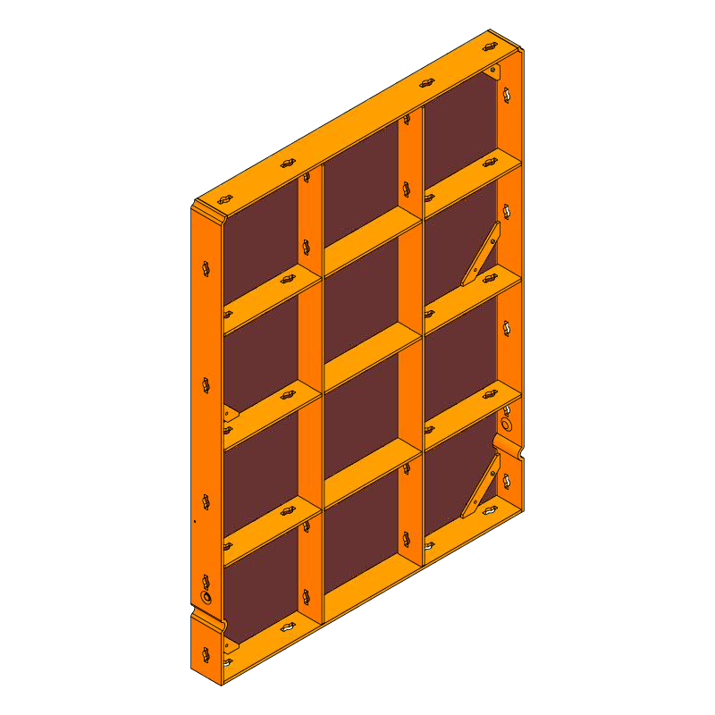 Mit der Abmessung 75 x 100 cm bildet es zusammen mit den anderen Elementbreiten unter 75 cm die Passelemente der Schalhöhe 1,00 m. Neben dem starken, massiven Flachstahlrahmen besteht das Schalelement aus einer Birkensperrholzplatte. Die Schalhaut wird von Längs- und Quergittern unterstützt, die im Abstand von 25 x 25 cm verschweißt sind.
